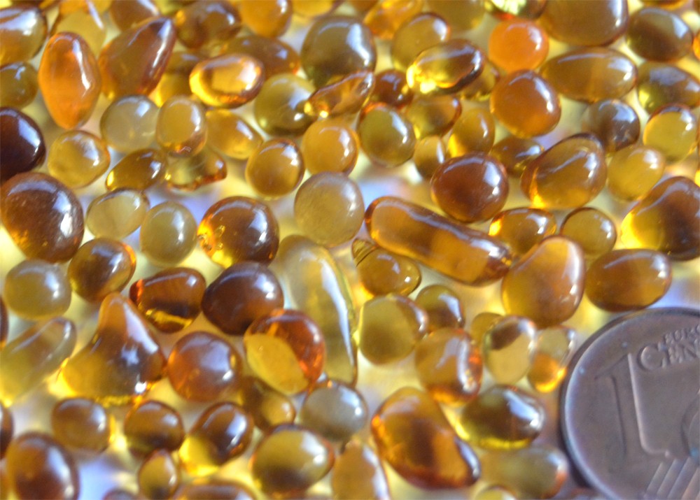 100 Gramm (ca. 600 St.) Glaskiesel (Glaskügelchen) unregelmäßig mit schimmernder Oberfläche (Iridium-Effekt) Größe ca. 3-10mm (meistens 3-6 mm) bernsteinfarben