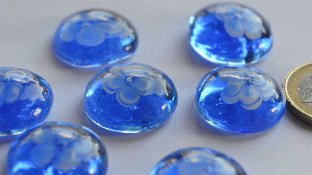 Sie erhalten 1 außergewöhnliches Glasnugget: transparenter Stein mit einem eingeschlossenen nicht transparenten Blütenmuster. Die Stärke ist ca. 7-8mm. Dies entspricht einer Fläche von ca. 19x21mm.