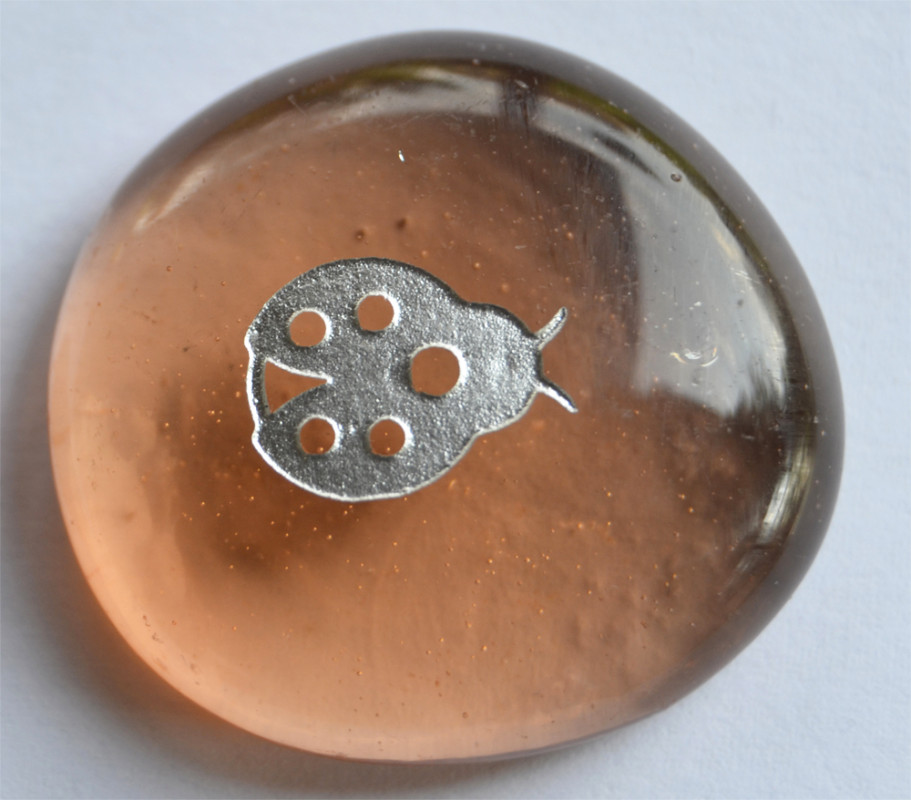 Die Stärke ist ca. 8-10 mm. Dies entspricht einer Fläche von ca. 2,5x3 cm. Diese Glas-Nuggets ist farbecht. Das Motiv ist durch Hand eingraviert worden.