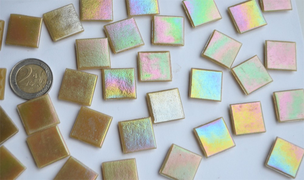 50 Stück Glasmosaiksteine mit wunderschön schimmernder Oberfläche (Iridium-Effekt) a 2x2x0,4 cm in ca. 145 Grammbeutel.