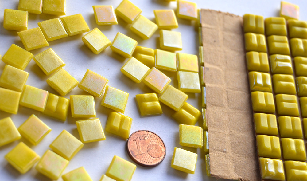 64 Stück (ca. 40g.) Glas Mosaiksteine mit wünderschönen Regenbogenschimmer (Iridum-Effekt) a 1x1 cm gelb