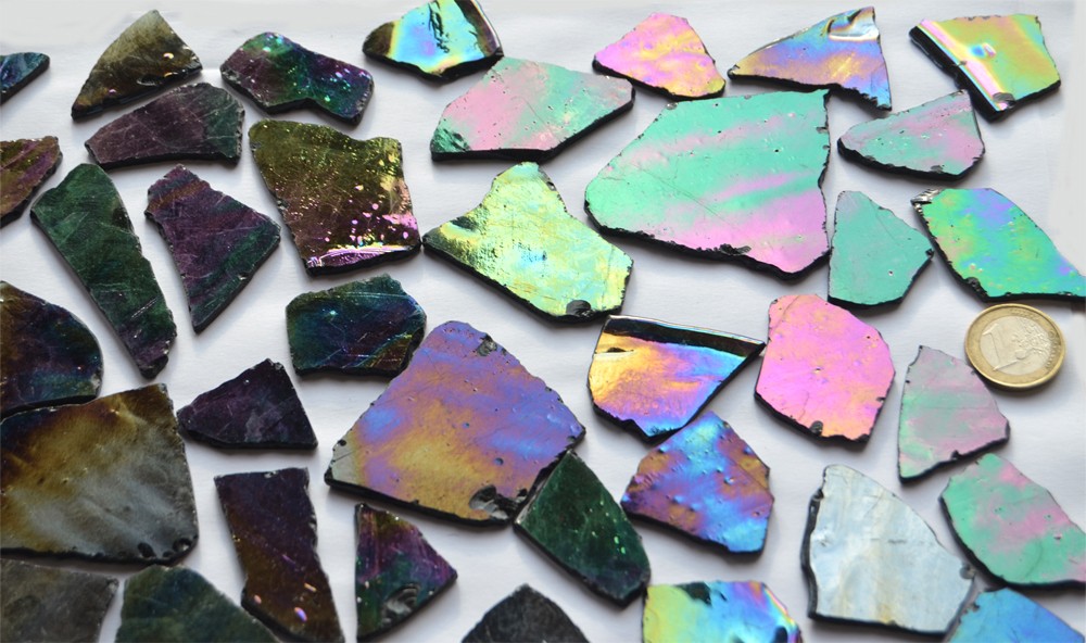600g (ca. 60-90 Stück) Tiffany Glas unbearbeitet in schwarz auf einer Seite perlmutt schimmernd mit vielen Unregelmässigkeiten in der Oberfläche