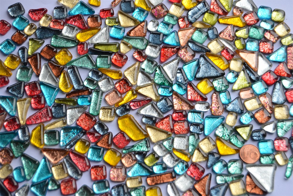Diese Glas Mosaiksteine mit schönem Muster haben eine schön glänzende, gewölbte transparente Oberfläche, wobei das Glas auf der Unterseite eingefärbt ist, mit abgerundeten Ecken und Kanten. Auf der Unterseite sind sie farbig gemustert, auf der Rückseite beschichtet.